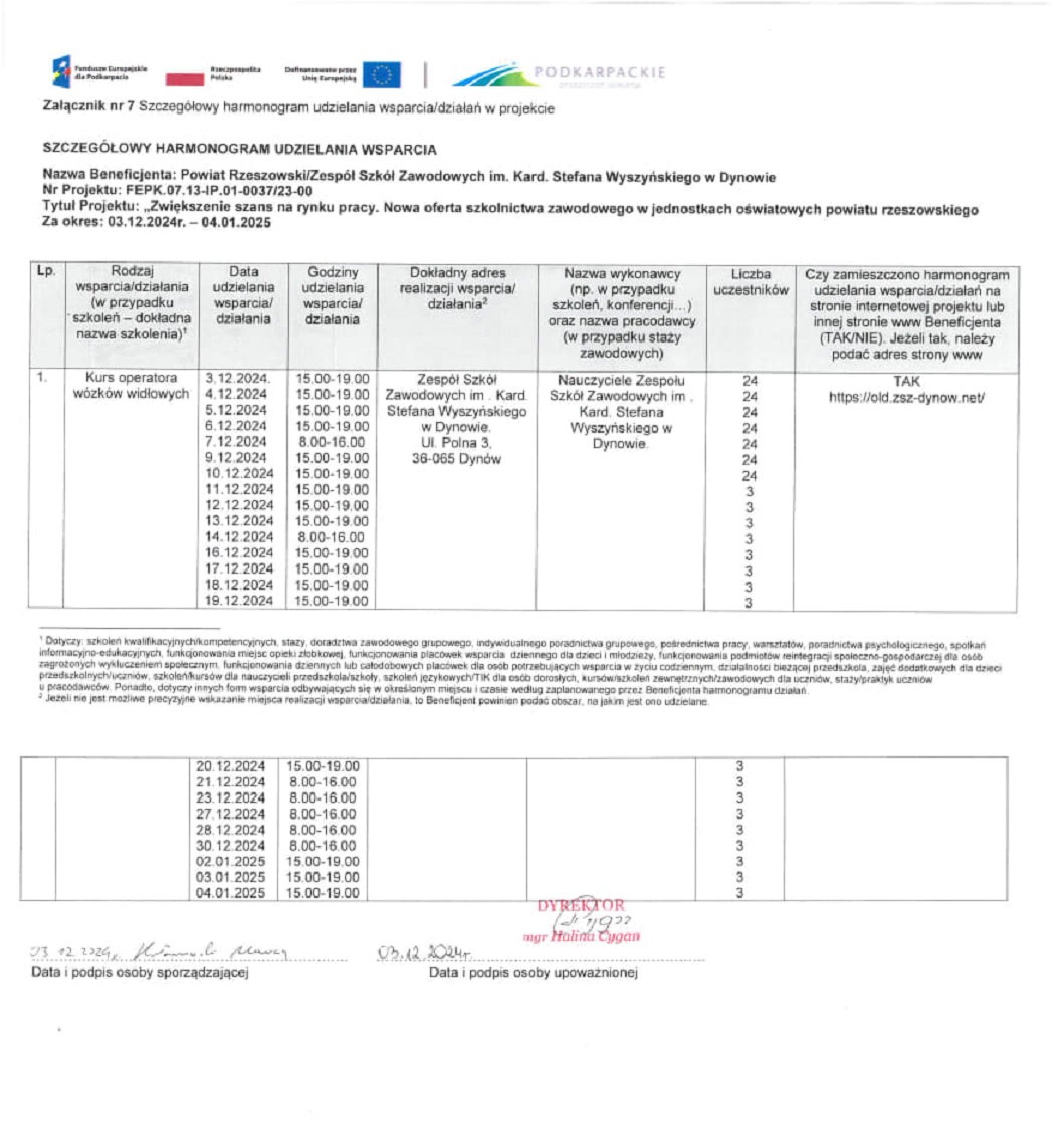 3 grudnia 2024 r. SZCZEGÓŁOWY HARMONOGRAM UDZIELANIA WSPARCIA