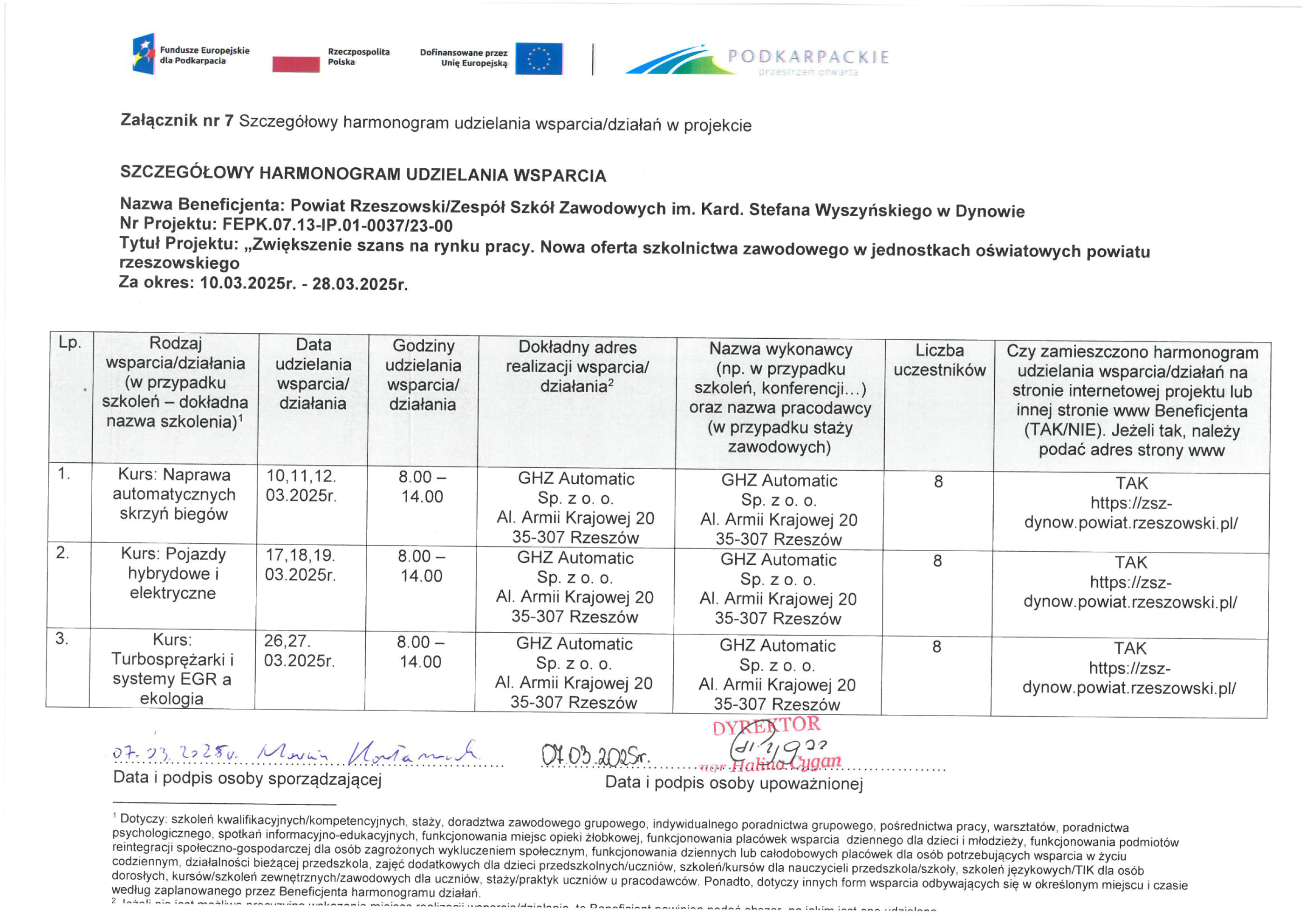 7 marca 2025 r. SZCZEGÓŁOWY HARMONOGRAM UDZIELANIA WSPARCIA