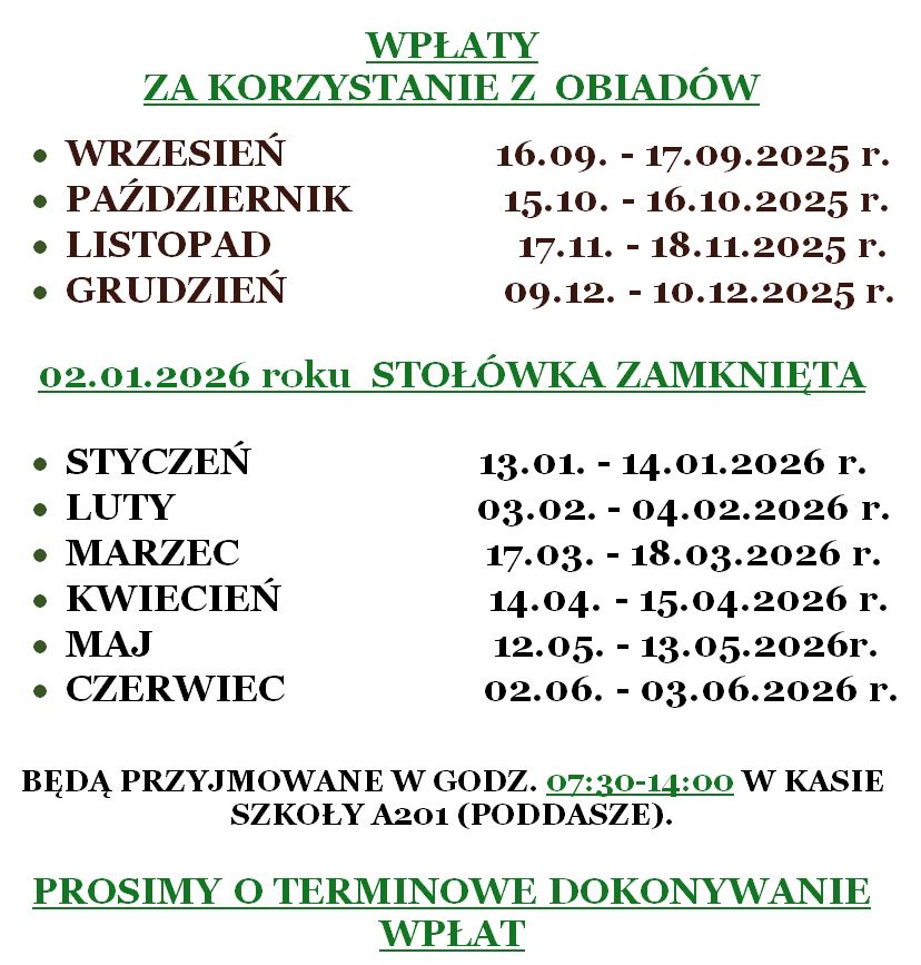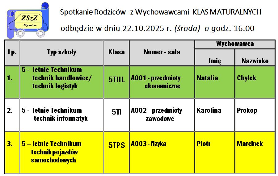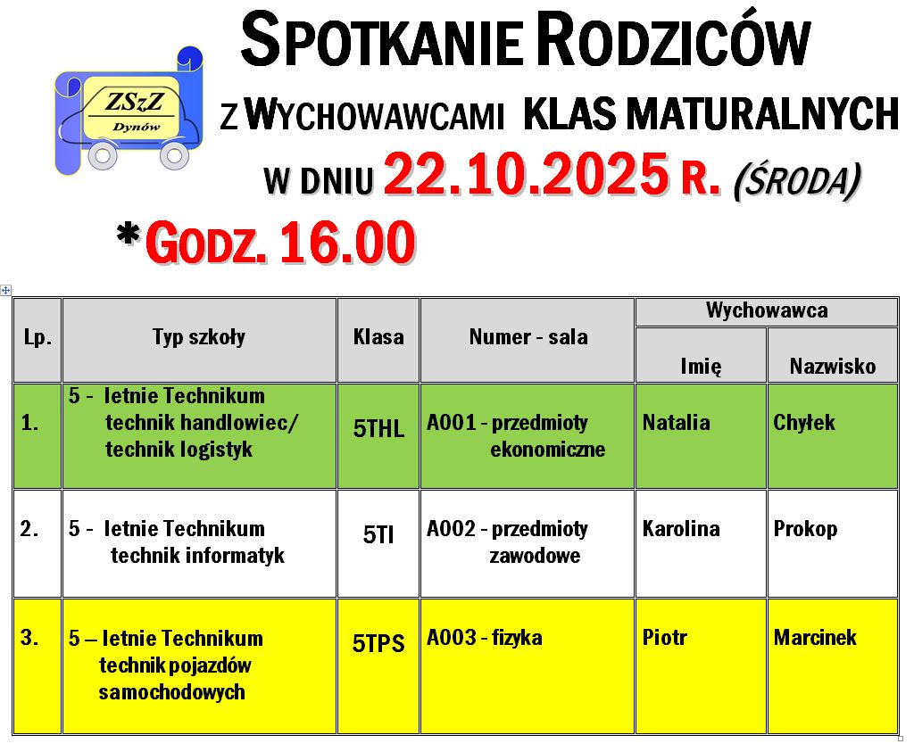 16.10.2025 r.(czwartek) - XIII edycja Wojewódzkiego Konkursu „Leśne dyktando”. 21.10.2025 r.(wtorek) - RP - omówienie wyników nauczania i zachowania za połowę I półrocza w kl. V. 22.10.2025 r.(środa) - spotkanie z rodzicami (klasy maturalne) wg oddzielnego harmonogramu. 28.10.2025 r.(wtorek) - badanie kompetencji z realizacji podst. programowej z j. polskiego – 5TI, 5THL, 5TPS. 29.10.2025 r.(środa) - badanie kompetencji z realizacji podst. programowej z matematyki - 5TI, 5THL, 5TPS. 30.10.2025 r.(czwartek) - badanie kompetencji z realizacji podst. programowej z j. obcych – 5TI, 5THL, 5TPS.