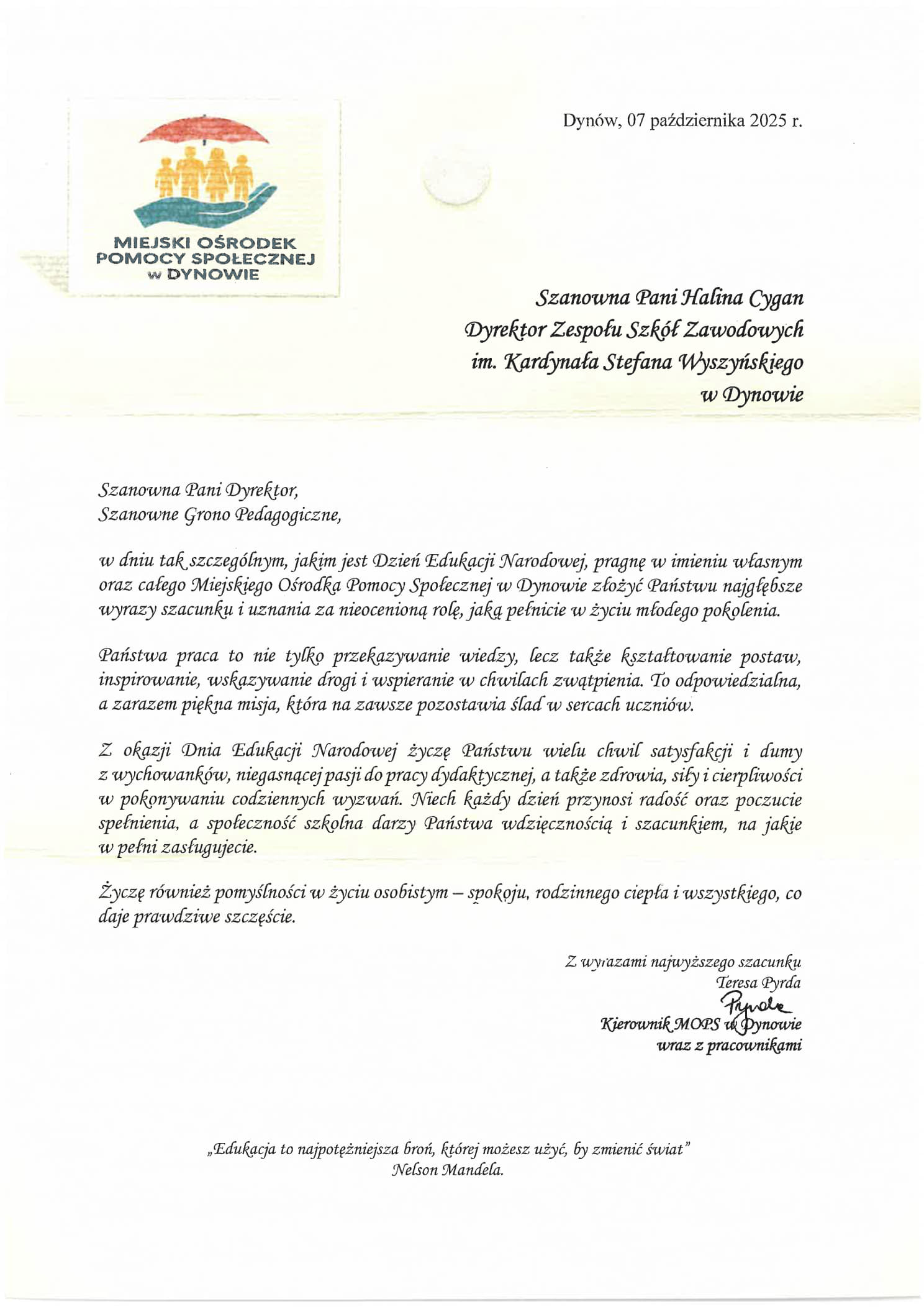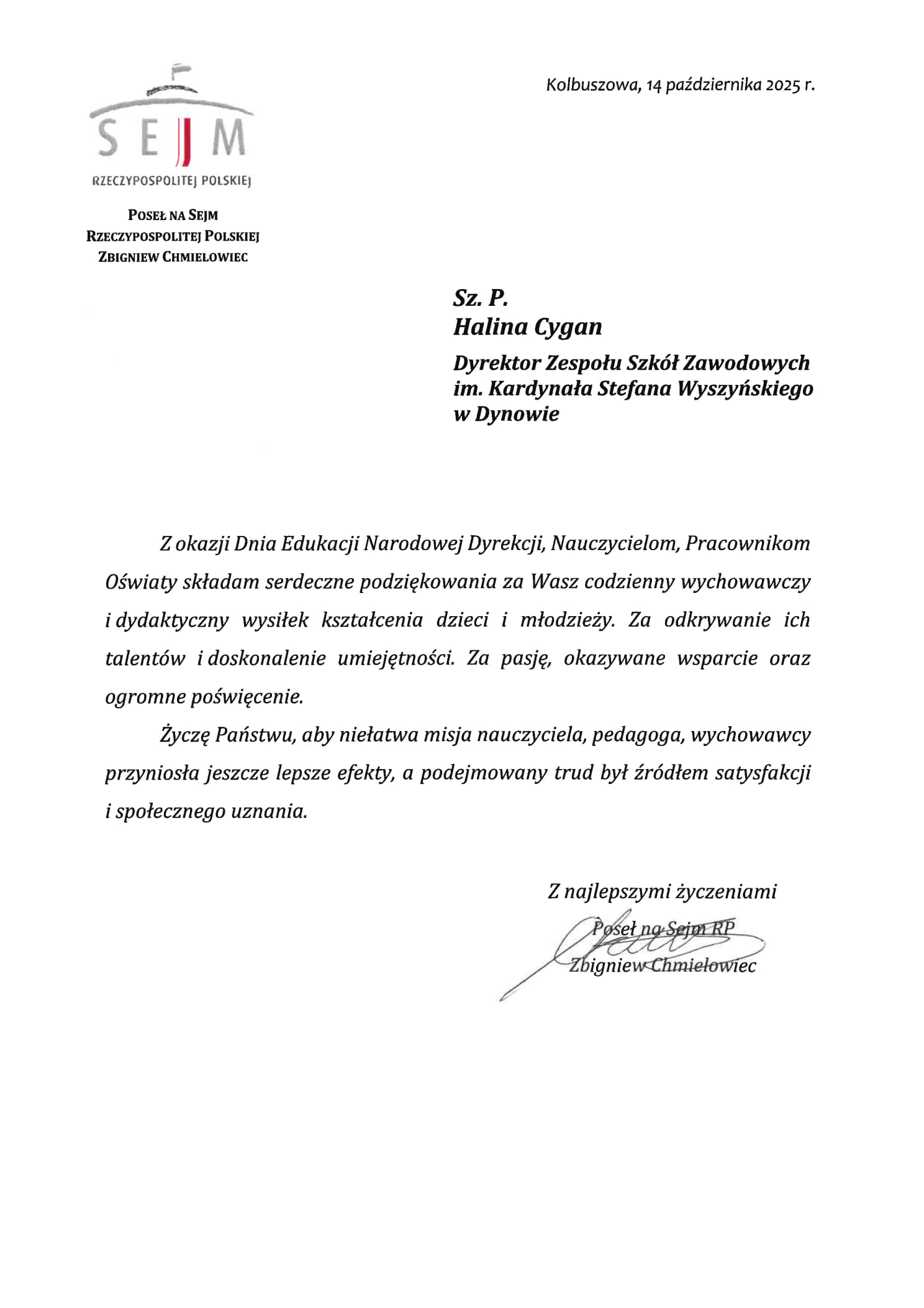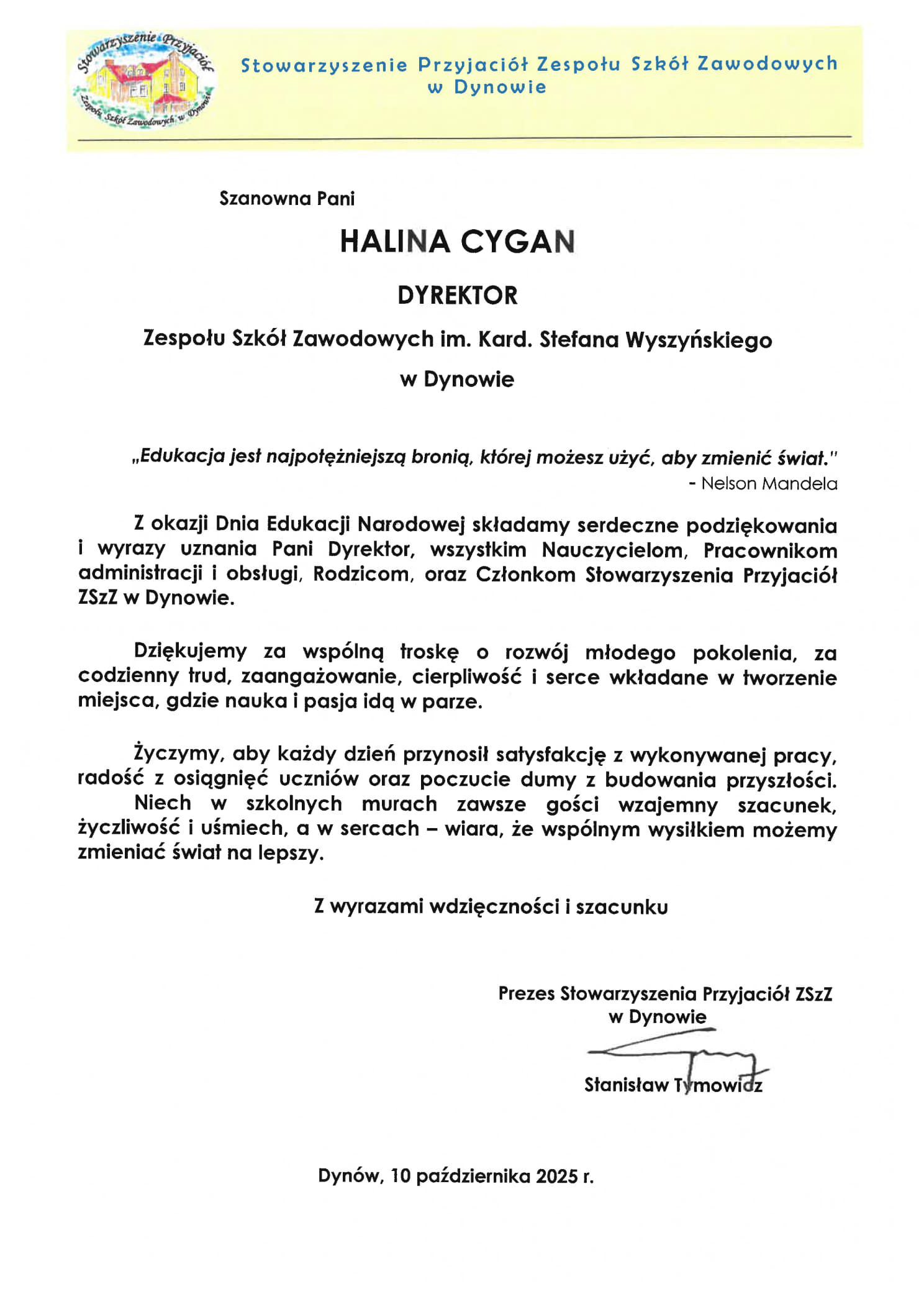 10 października 2025 r. młodzież Zespołu Szkół Zawodowych im. Kardynała Stefana Wyszyńskiego w Dynowie, przygotowanym pod opieką Pani Agnieszki Kędzierskiej i Pana Ryszarda Dymczaka programem artystycznym powitała: Panią Ewę Hubkę–Saleh Przewodniczącą Rady Rodziców, wszystkich nauczycieli, pracowników niepedagogicznych na uroczystej akademii z okazji Dnia Edukacji Narodowej, także z udziałem pocztu sztandarowego (pod opieką Pani Izabeli Jach, Pani Karoliny Prokop i Pani Renaty Potocznej–Smaroń). Pani Dyrektor Halina Cygan przekazując życzenia z okazji Dnia Edukacji Narodowej, w swoim wystąpieniu powiedziała, m.in. „... wyrażam słowa uznania dla całego Grona Pedagogicznego, wszystkich Pracowników Szkoły. Życzę wszystkim nauczycielom aby trudowi wkładanemu w edukację towarzyszyły zaufanie i szacunek uczniów oraz satysfakcja z dobrze wykonywanej pracy. Niech praca z młodzieżą będzie przyjemnością, a sukcesy uczniów będą nagrodą za codzienny trud, serce. Byłym Nauczycielom i Pracownikom Szkoły, chciałam także podziękować za wieloletni trud włożony w wychowanie młodego pokolenia rozwój Zespołu Szkół Zawodowych im. Kardynała Stefana Wyszyńskiego w Dynowie….” /.../ czytaj więcej ..>>pdf galeria zdjęć ..>>