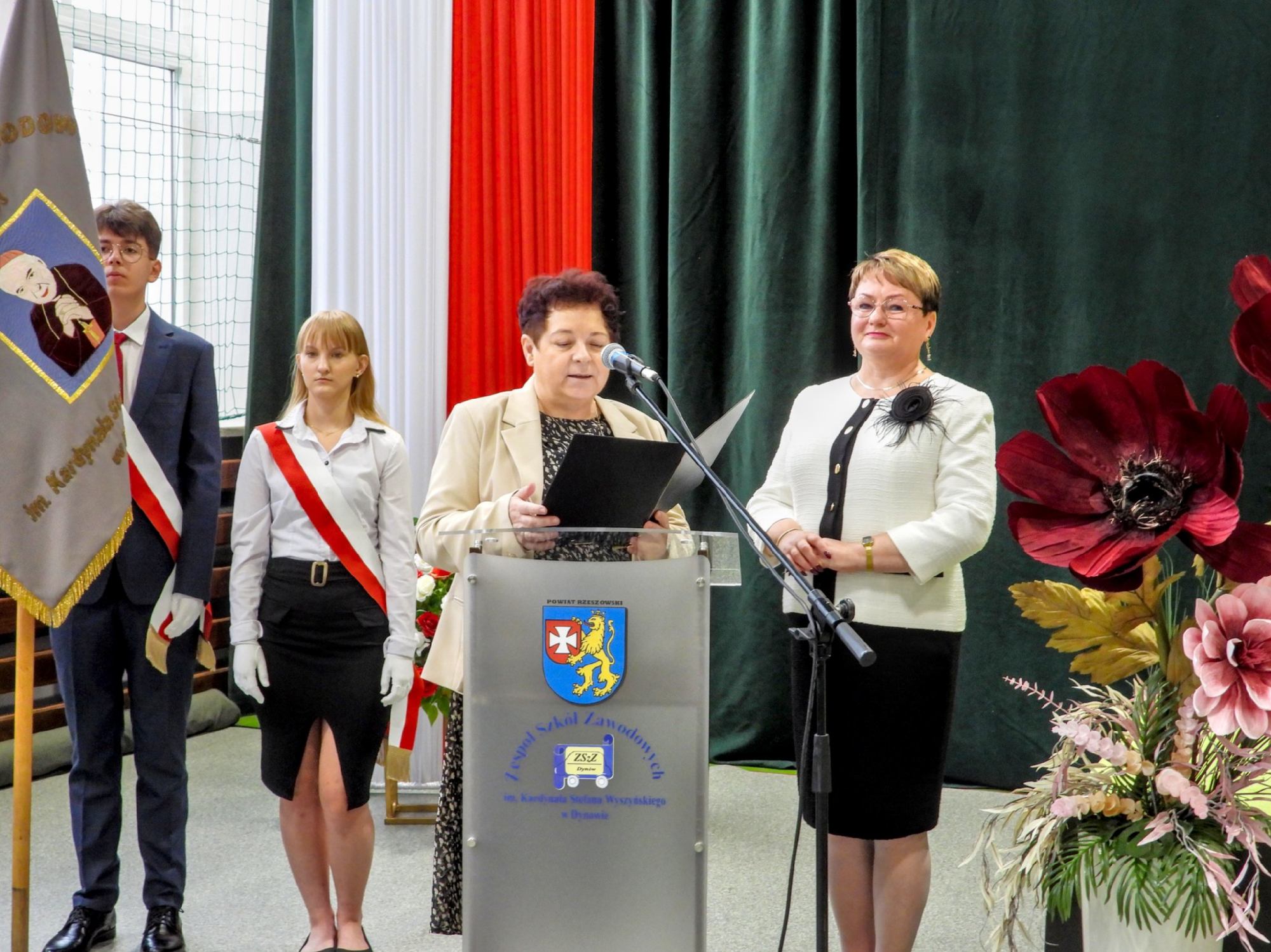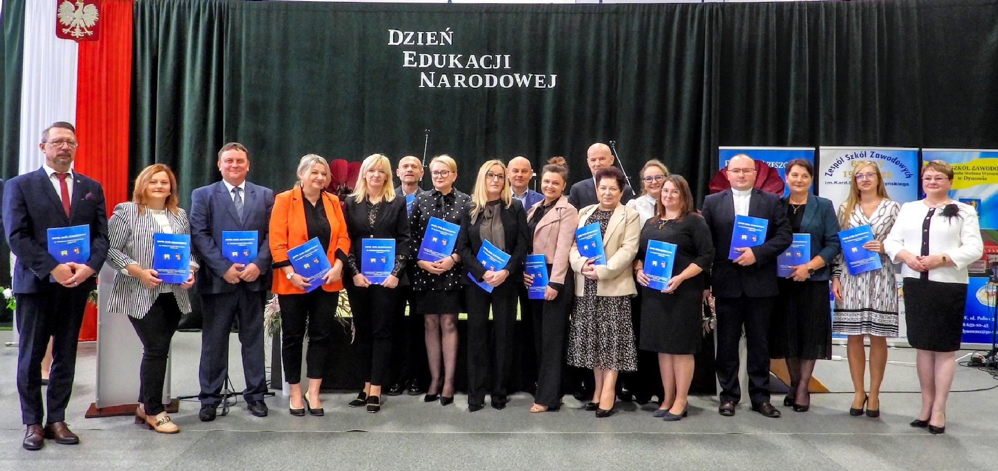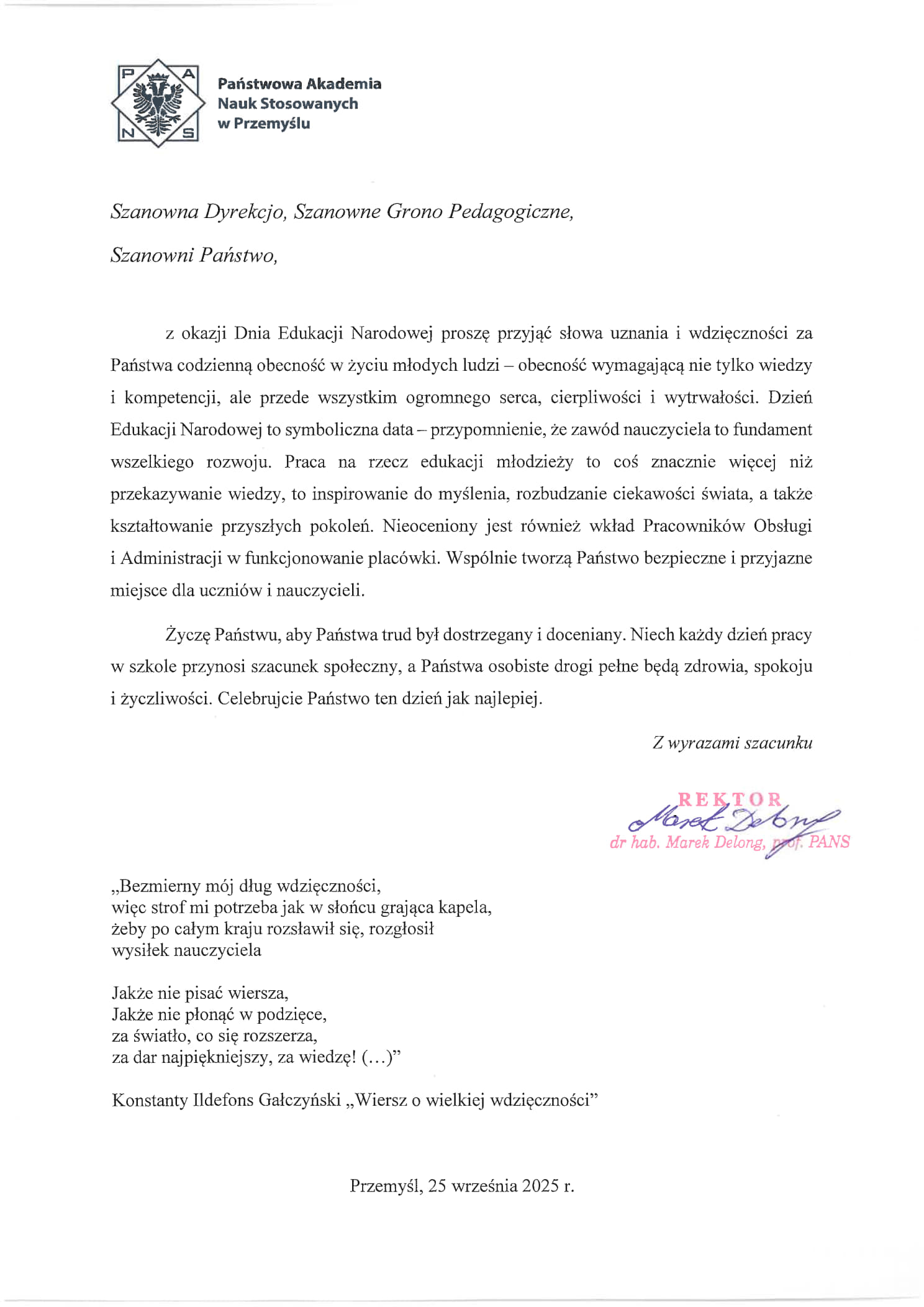10 października 2025 r. młodzież Zespołu Szkół Zawodowych im. Kardynała Stefana Wyszyńskiego w Dynowie, przygotowanym pod opieką Pani Agnieszki Kędzierskiej i Pana Ryszarda Dymczaka programem artystycznym powitała: Panią Ewę Hubkę–Saleh Przewodniczącą Rady Rodziców, wszystkich nauczycieli, pracowników niepedagogicznych na uroczystej akademii z okazji Dnia Edukacji Narodowej, także z udziałem pocztu sztandarowego (pod opieką Pani Izabeli Jach, Pani Karoliny Prokop i Pani Renaty Potocznej–Smaroń). Pani Dyrektor Halina Cygan przekazując życzenia z okazji Dnia Edukacji Narodowej, w swoim wystąpieniu powiedziała, m.in. „... wyrażam słowa uznania dla całego Grona Pedagogicznego, wszystkich Pracowników Szkoły. Życzę wszystkim nauczycielom aby trudowi wkładanemu w edukację towarzyszyły zaufanie i szacunek uczniów oraz satysfakcja z dobrze wykonywanej pracy. Niech praca z młodzieżą będzie przyjemnością, a sukcesy uczniów będą nagrodą za codzienny trud, serce. Byłym Nauczycielom i Pracownikom Szkoły, chciałam także podziękować za wieloletni trud włożony w wychowanie młodego pokolenia rozwój Zespołu Szkół Zawodowych im. Kardynała Stefana Wyszyńskiego w Dynowie….” /.../ czytaj więcej ..>>pdf galeria zdjęć ..>>